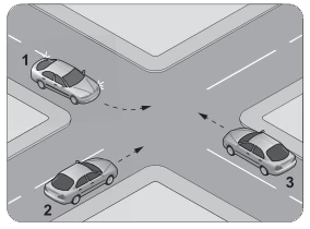 Şekildeki gibi kontrolsüz kavşakta karşılaşan araçların geçiş hakkı sıralaması nasıl olmalıdır?